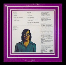 2) 2.) Late Letter (Pete McCabe) - 2:46 rating: *** stars The pretty banjo powered "Late Letter" started out as the album's most "normal" sounding song. Seemingly a fans tribute to Marilyn Monroe, the track demonstrated McCabe could actually carry a tune. I've always wondered why McCabe titled it "Late Letter". 3.) The Experiment (Pete McCabe) - 3:04 rating: *** stars Featuring Larry Knechtell on harpsichord "The Experiment" was lyrically dense and melodically thin. With his vocals multi-tracked, McCabe's reflections on what was seemingly a failed romance were mildly entertaining. McCabe's described the song's meaning: "With "The Experiment" I was in the fifth year of art college trying to get a degree, which actually never happened because I dropped out as soon as I got the record contract. One of the things I had to do was I had to take a psychology class and I think some of that terminology, the notion of proving a hypothesis, being an unbiased experimenter, I really wasn’t that great in the class, but I came away with some of those ideas. I had a girlfriend at that time and eventually broke up with her and was starting in with another one and it seemed like we really were not all that compatible, it seemed like both of us felt life was mostly winter. "The Experiment" was about that, looking at a romance in terms of it being an experiment." 4.) I Put The Smiles Back On Their Faces (Pete McCabe) - 2:50 rating: * star What in the world ... McCabe obviously had an eclectic childhood. "Before the record Bill Szymczyk and his assistant Alan Blazek had got me to come over and play them all the good tunes I had so they could go through them and pick out the ones to do. and they came to "I Put The Smiles Back On Their Faces" they said, "That’s kinda interesting but what the heck is that song about?" I said it was about a paranoid mortician and as soon as I said that, they got the whole song. I put the smiles back on their faces is what he does for a living. As a child I used to stay over at my grandmother’s in this house I had a nostalgic feeling for but it was also kind of a scary house. And I just remember brushing my teeth late at night there and there was a big banister down the hall and it was all dark. What’s out there waiting for me? So a little of the paranoia came from that, I guess." 5.) The Man Who Ate The Plant (Pete McCabe) - 2:48 rating: * star The title track was one of the first tunes McCabe wrote, stretching back to his time in junior high school playing with the folk group The Timbermen. Showcasing McCabe on keyboards and banjo this "heartbreak" ballad has always reminded me of a mash-up of Randy Newman and Kermit the Frog. Anyone care to hazard a guess what it's about? I've always wondered what the sessions musicians thought about this one. It was selected as the album title since McCabe and company couldn't come up with a better title. MCCabe's description of the song: "For the song "The Man Who Ate The Plant" I felt like I was almost channelling something strange there because that was a very early banjo tune and I was just playing these C minor chords over and over again until something struck me as the kind of words that should go to it, and this mysterious song emerged. It took place in this alternate universe where no one had ever eaten a plant before and how the neighbourhood might react to someone who did something so strange. That’s probably the most psychedelic tune on the record but that was way before I heard anything about drugs. Of course by the time I made the record that was a big part of my life for some time." 6.) Music Box (Pete McCabe) - 5:04 rating: * star As expressed below, McCabe's fears about being overwhelmed by the orchestration pretty much came true. "Music Box" is certainly about being frustrated with trying to link with the opposite sex. I did notice that sometimes women seemed to be very interested in me as a musician but that was about it. At that time I was starting to write piano tunes and "Music Box" and "Suicide" were the only two I had at the time and I didn’t realise that Szymczyk had in mind that "Music Box" was going to be the giant production number that it was. I was trying to keep up with the rhythm section because they really took off at the end. When we overdubbed the strings and horns it was pretty boffo. That tune had so many instruments on it, I believe it had thirty pieces and it was really fun to sit there and listen to this orchestra on these giant speakers. Though from time to time, not knowing that much about studio recording I was secretly afraid I was going to get covered up by all these instruments, but Bill just wanted to hear them nice and loud when he was putting down the basic tracks."