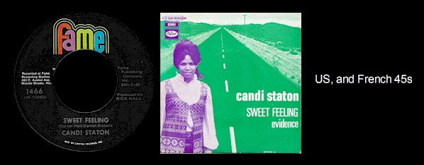 - 1970's "He Called Me Baby" b/w "What Would Become of Me" (Fame catalog number P-1476) # 9 R&B; # 52 pop 2.) Sweet Feeling (Clarence Carter - Candi Staton - Rick Hall - Marcus Daniel) - 2:42 rating: **** stars Co-written with then-husband Clarence Carter, "Sweet Feeling" was one of those bluesy numbers that sounded like it would have fit on a classic Aretha album. Always loved the stinging lead guitar that went with it and her nod to "In the Midnight Hour". Another single, though in Holland the 45 was flipped with the non-LP track "Evidence" serving as the "A" side.