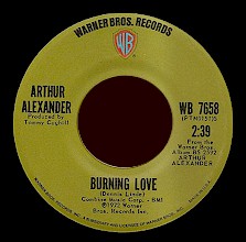 **** stars 3.) Go On Home Girl (Arthur Alexander) - 2:43 rating: *** stars An Alexander original, the ballad 'Go On Home Girl' first appeared as a 1962 single. Under the title 'Go Home, Girl' it served as the "B" side to 'You're the Reason.' Other than giving the song a slightly modified title and an updated '70s sound, the remake didn't really differ much from the original. Ah, the heartache associated with stealing someone's girlfriend. 4.) In The Middle Of It All (Arthur Alexander) - 3:05 rating: **** stars If you were looking for a "heartbreak" song for a movie, you'd be hard pressed to find something more poignant than Alexander's 'In The Middle Of It All.' This was another track that Arthur had recorded earlier. In fact, he apparently laid down at least four versions of the song. About the best compliment I can make is that anyone who loves Solomon Burke is going to fall head-over-heels for this one. 5.) Burning Love (Dennis Linde) - 2:39 rating: **** stars Yes, Elvis' cover is the one most folks know. It's the version I grew up with and is certainly more pop-oriented than Alexander's version. That said, I love this version. It's not drastically different, but Alexander's earnest delivery is a hoot. My only complaint has to do with the abrupt fade-out. The song was simply too short. Warner Brothers actually released it as a single before the Elvis version came out, but they did little to promote the 45. Shame.