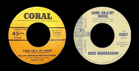 credited to William Saroyan and Ross Bagdasarian - 1951's 'Come On-a My House' b/w 'Oh! Beauty!' (Coral catalog 9 60544) credited to Ross Bagdasarian - 1955's 'Come On-a My House' b/w 'Gotta Get To Your House' (Liberty catalog number 55837)