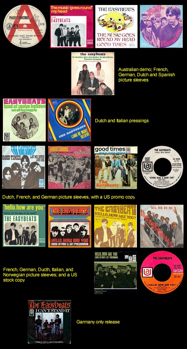 1.) Gonna Have a Good Time (Good Times) (Harry Vanda - Steve Young) - 3:25 rating: **** stars And you didn't think bands were still playing hardcore garage tunes in the late-'60s? Well The Easybeats were doing it and doing it with style. One of the tunes salvaged from the previous recording sessions, this one had also previously appeared as the flip side on the Australian 'Land of Make-Believe' 45. Interesting how Steve Wright's growl of a voice has always reminded me a bit of the late Bon Scott. For anyone curious to see what all the excitement was about, YouTube has an enthusiastic black and white clip taken from a 1968 performance on the German Beat club show: https://www.youtube.com/watch?v=zBg6cos3LVI rating: **** stars rating: **** stars 2.) What In the World (Harry Vanda - Steve Young) - 2:15 rating: **** stars Geez, who would have expected a bunch of Australians to turn in such a stunning slice of blue-eyed soul ? Propelled by Dick Diamonde's classic bass line, it was easily one of the album highlights. The addictive refrain actually managed to make heartbreak sound dance-ready. rating: **** stars 3.) Falling Off the Edge of the World (Harry Vanda - Steve Young) - 2:55 rating: *** stars Personally I wouldn't have expected them to be capable of pulling off a slice of Bee Gees-styled Baroque pop. While it wasn't my favorite tune, it was far better than you would have expected and could have given the Gibbs a run for the charts. 4.) The Music Goes Round My Head (Harry Vanda - Steve Young) - 2:45 rating: *** stars Strange toytown tune that sounded very out of place in The Easybeats catalog. Cute, but very different and took awhile to get acclimated to. 5.) Can't Take My Eyes Off You (Bob Crewe - Bob Gaudio) - 3:28 rating: ** stars It's hard to imagine the band would have come up with the idea to record this lounge act pop number ... 6.) Come In, You'll get Pneumonia (Harry Vanda - Steve Young - Tony Cahill) - 3:45 rating: **** stars It started out sounding like it was going to offer up another slice of Bee Gees-styled drama, but then it turned into a totally unexpected slice of pounding, pseudo-Gospel with a lyric that must have raised eyebrows at the time. Killer tune.