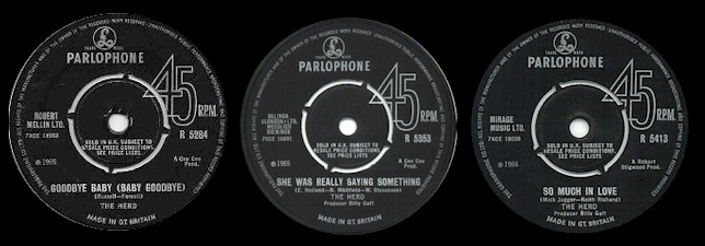 - 1965's "Goodbye Baby (Baby Goodbye)" b/w "Here Comes The Fool" (Parlophone catalog number R 5284) - 1965's "She Was Really Saying Something" b/w "It's Been A Long Time Baby" (Parlophone catalog number R 5353) - 1966's "So Much In Love" b/w "This Boy's Always Been True" (Parlophone catalog number R 5413)