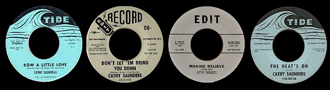 - 1961's 'Sow a Little Love' b/w 'This Angry World' (Tide catalog number T-045-A) - 1961's 'Don't Let 'em Bring You Down' b/w 'I'm Going Home' (Edit catalog number E-115-A) - 1962's 'Making Believe' b/w 'Restless and Running Wild' (Edit catalog number 45-00-2000) - 1962's 'I Said Johnny Be Good' b/w 'Stop That Lying' ' (Edit catalog 2002) - 1964's 'The Heat Is On' b/w 'Tomorrow Is Another Day' (Tide catalog number T-45-00-2007 AA)